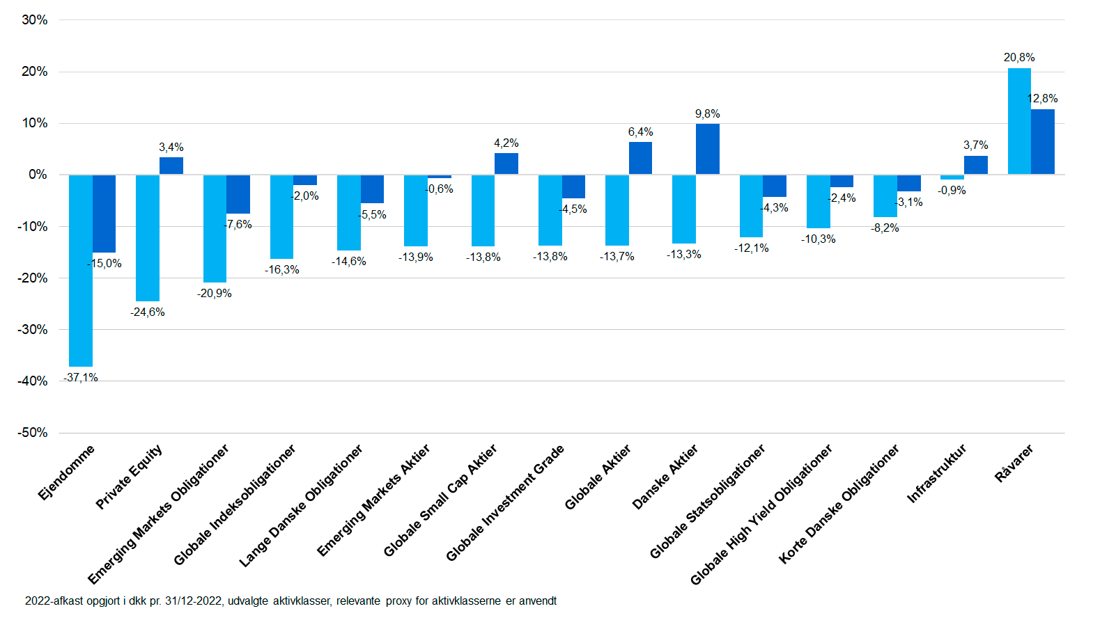 Grafikken viser 2022-afkast (lyseblå søjler) for forskellige aktivklasser samt årligt afkast i 3 år.